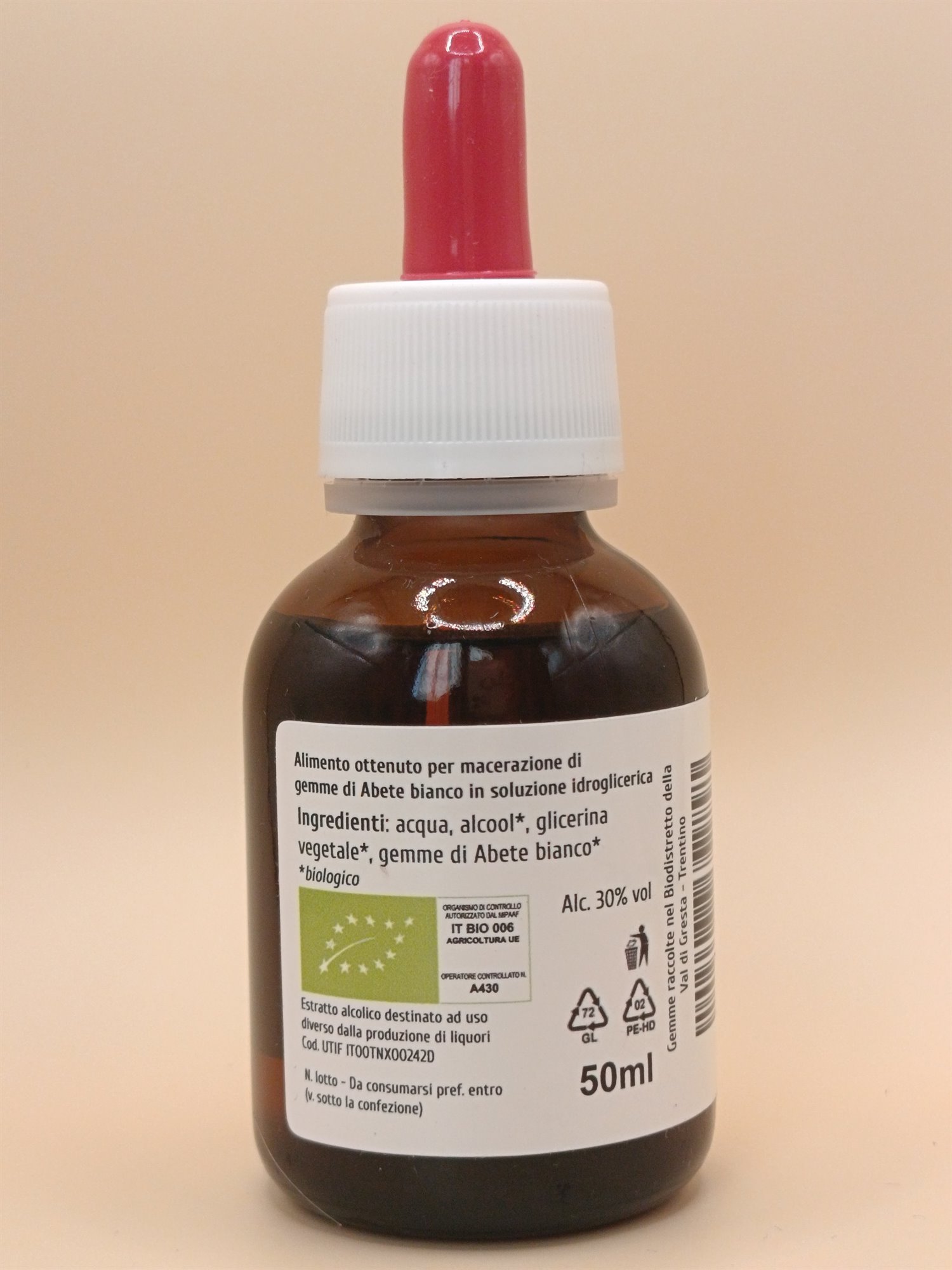 Ingredienti: glicerina vegetale*, alcool*, acqua, gemme di Abete bianco* (Abies alba Mill.)
