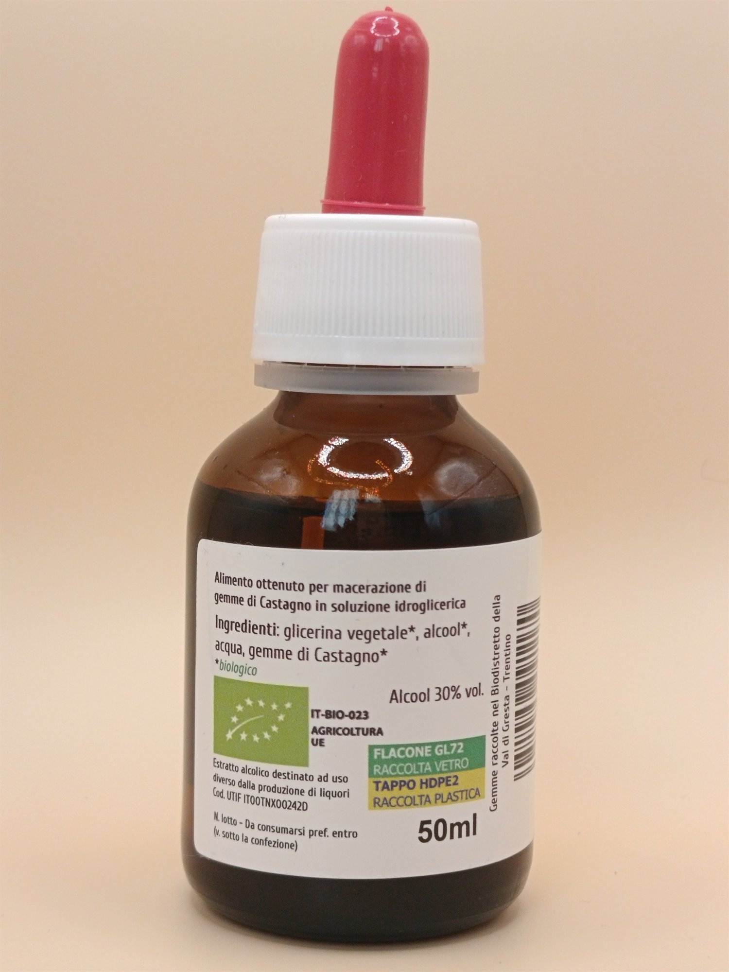 Ingredienti: glicerina vegetale*, alcool*, acqua, gemme di Castagno* (Castanea sativa Mill.)