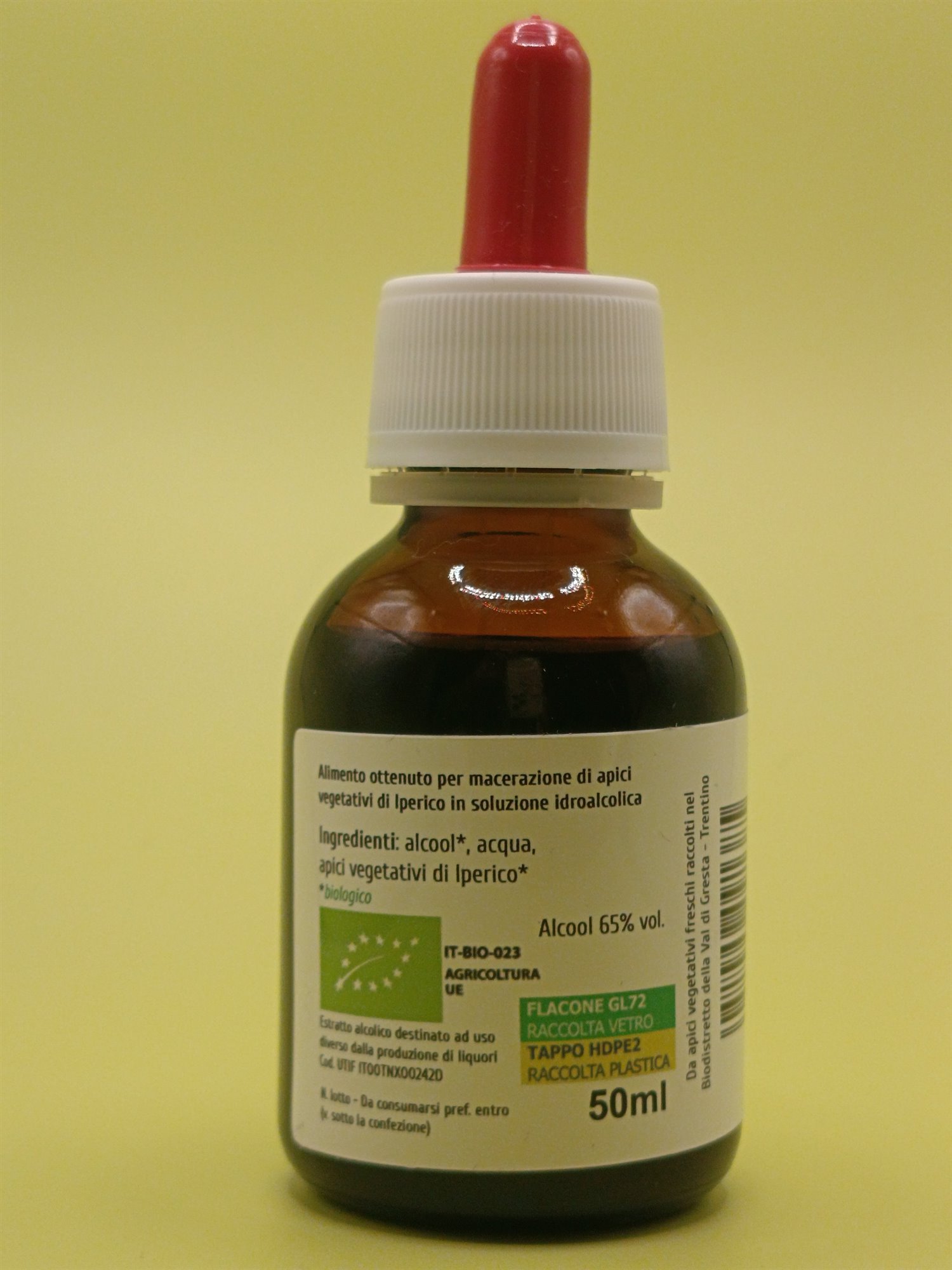 Ingredienti: alcool*, acqua, apici vegetativi di Iperico* (Hypericum perforatum L.)