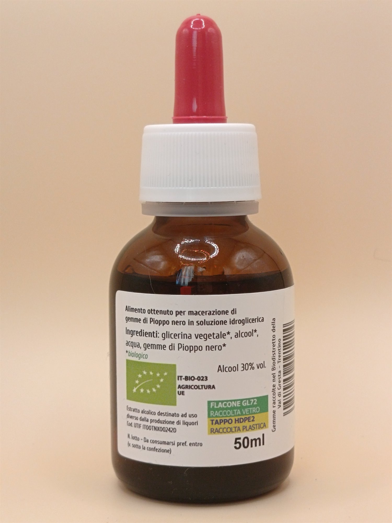 Ingredienti: glicerina vegetale*, alcool*, acqua, gemme di Pioppo nero* (Populus nigra L.)