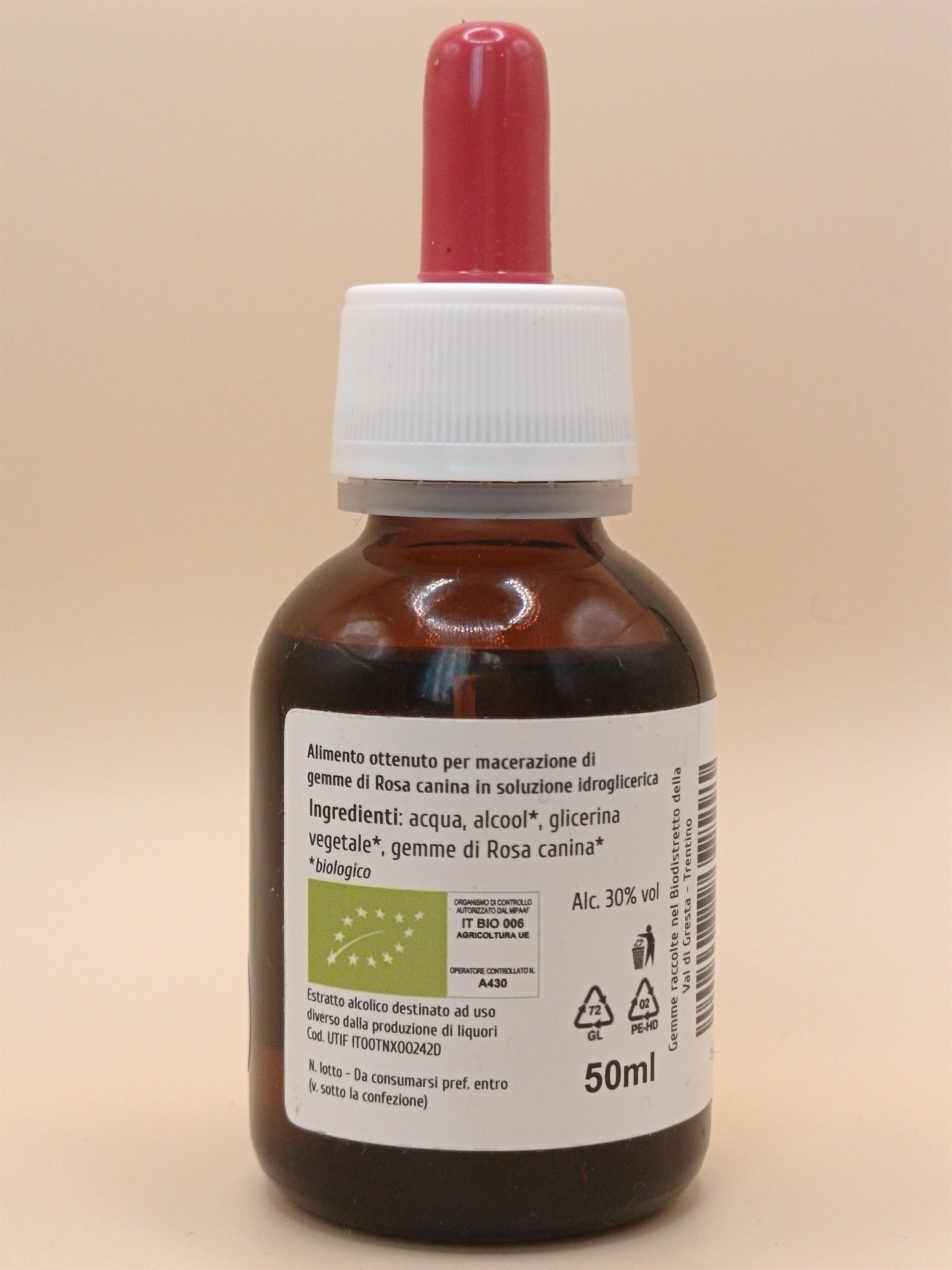 Ingredienti: glicerina vegetale*, alcool*, acqua, gemme di Rosa canina* (Rosa canina L.)