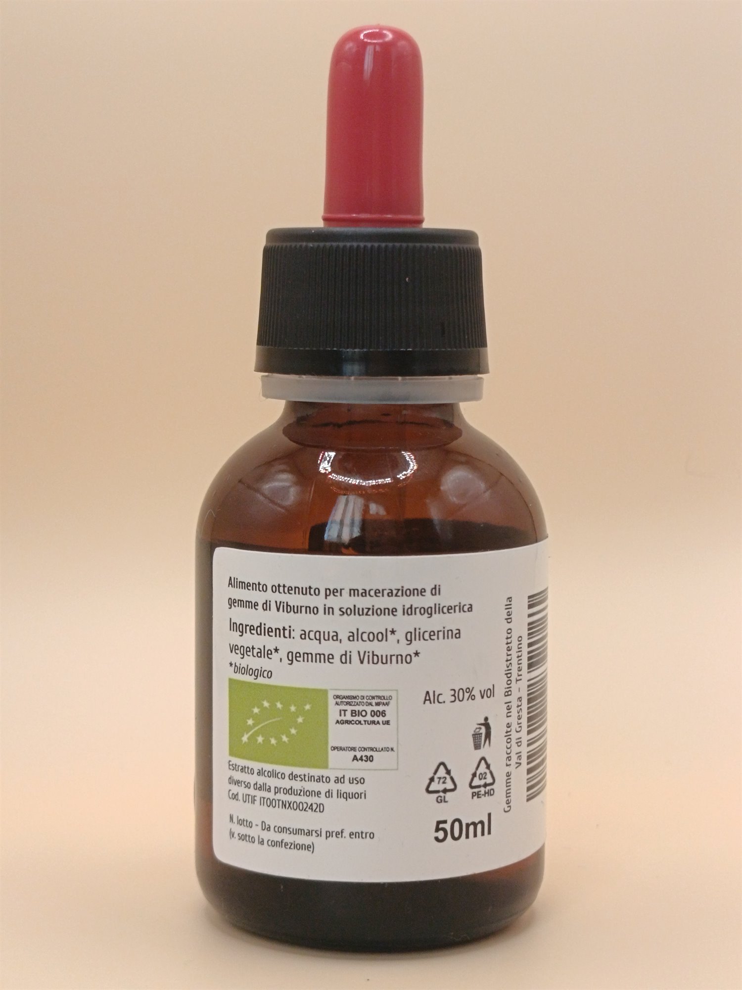 Ingredienti: glicerina vegetale*, alcool*, acqua, gemme di Viburno* (Viburnum lantana L.)