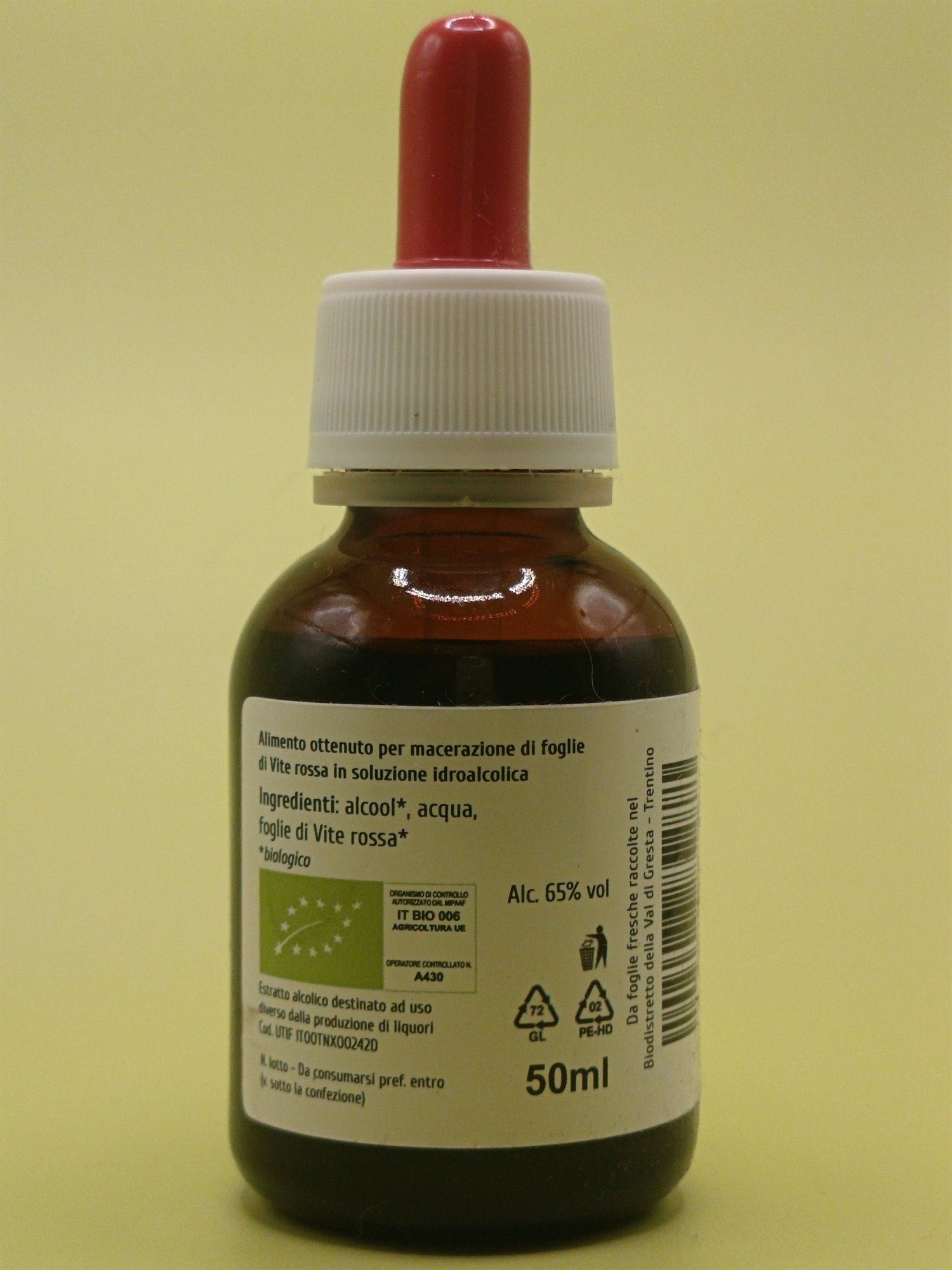 Ingredienti: alcool*, acqua, foglie di Vite rossa* (Vitis vinifera L.)
