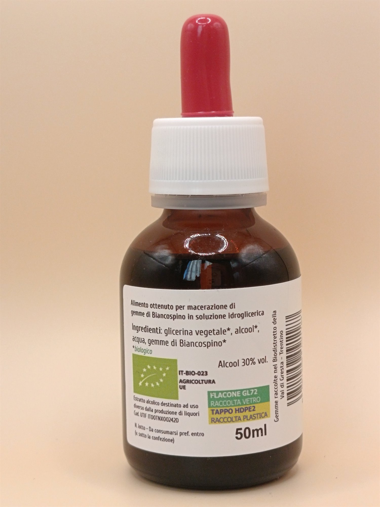 Ingredienti: glicerina vegetale*, alcool*, acqua, gemme di Biancospino* (Crataegus oxyacantha L.)