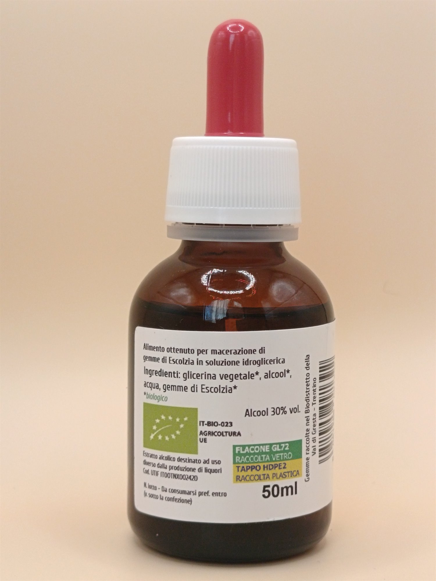 Ingredienti: glicerina vegetale*, alcool*, acqua, giovani foglie di Escolzia* (Eschscholtzia californica Cham.)