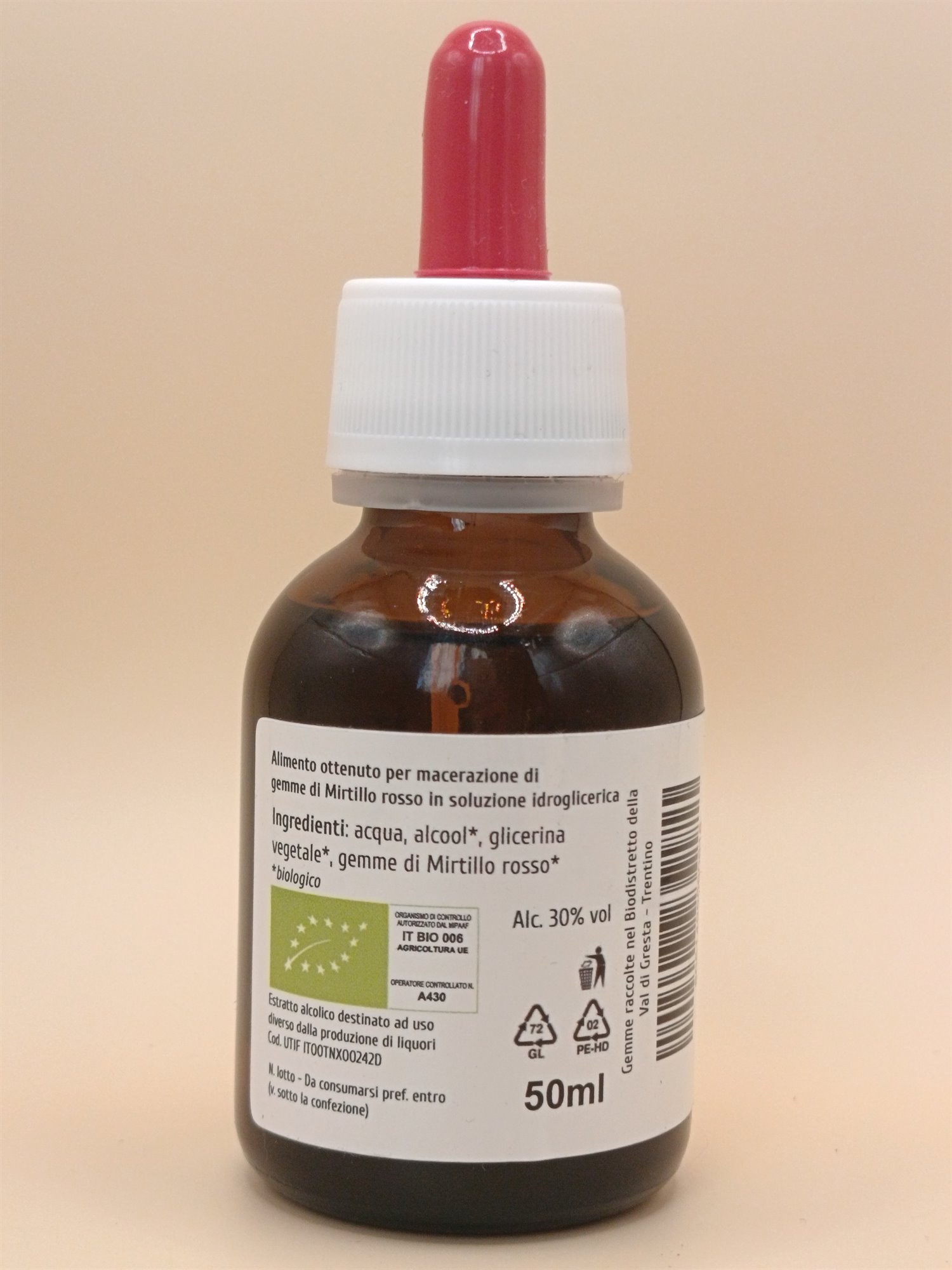 Ingredienti: glicerina vegetale*, alcool*, acqua, gemme di Mirtillo rosso* (Vaccinium vitis-idaea L.)