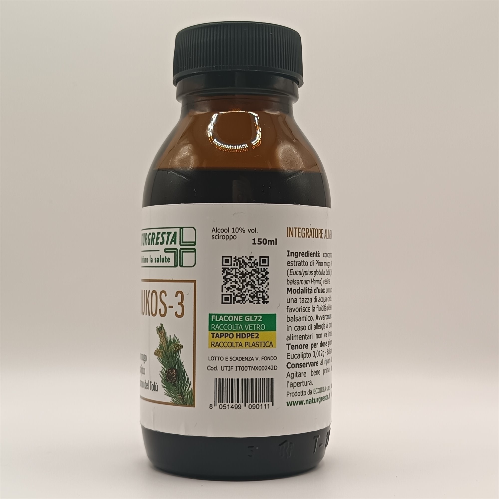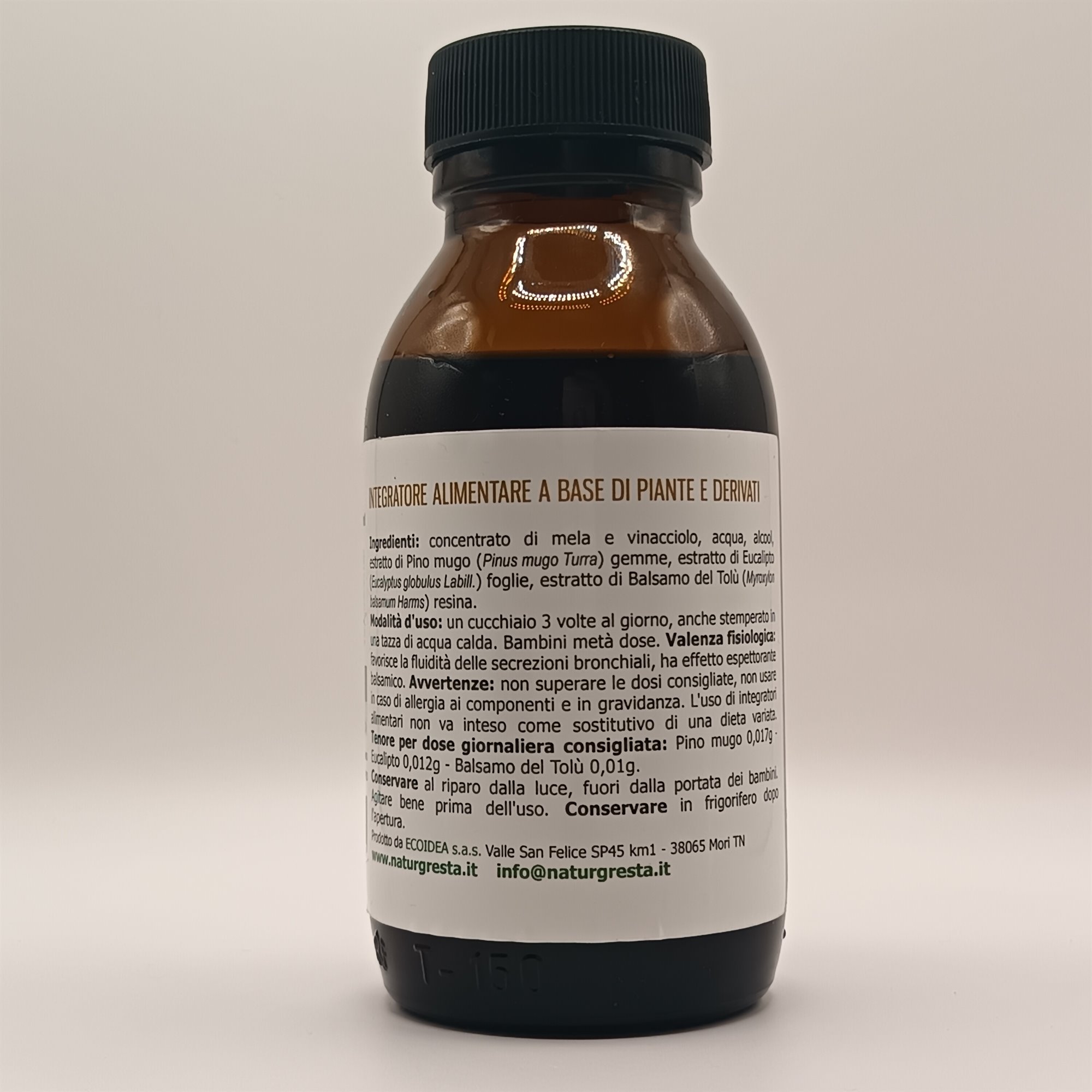 Ingredienti: concentrato di mela e vinacciolo, acqua, alcool, estratto di Pino mugo (Pinus mugo Turra) gemme, estratto di Eucalipto (Eucalyptus globulus Labill.) foglie, estratto di Balsamo del Tolù (Myroxylon balsamum Harms) resina
