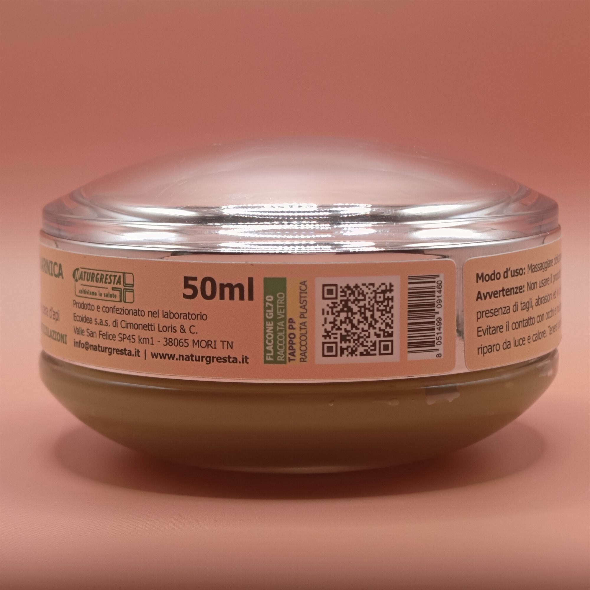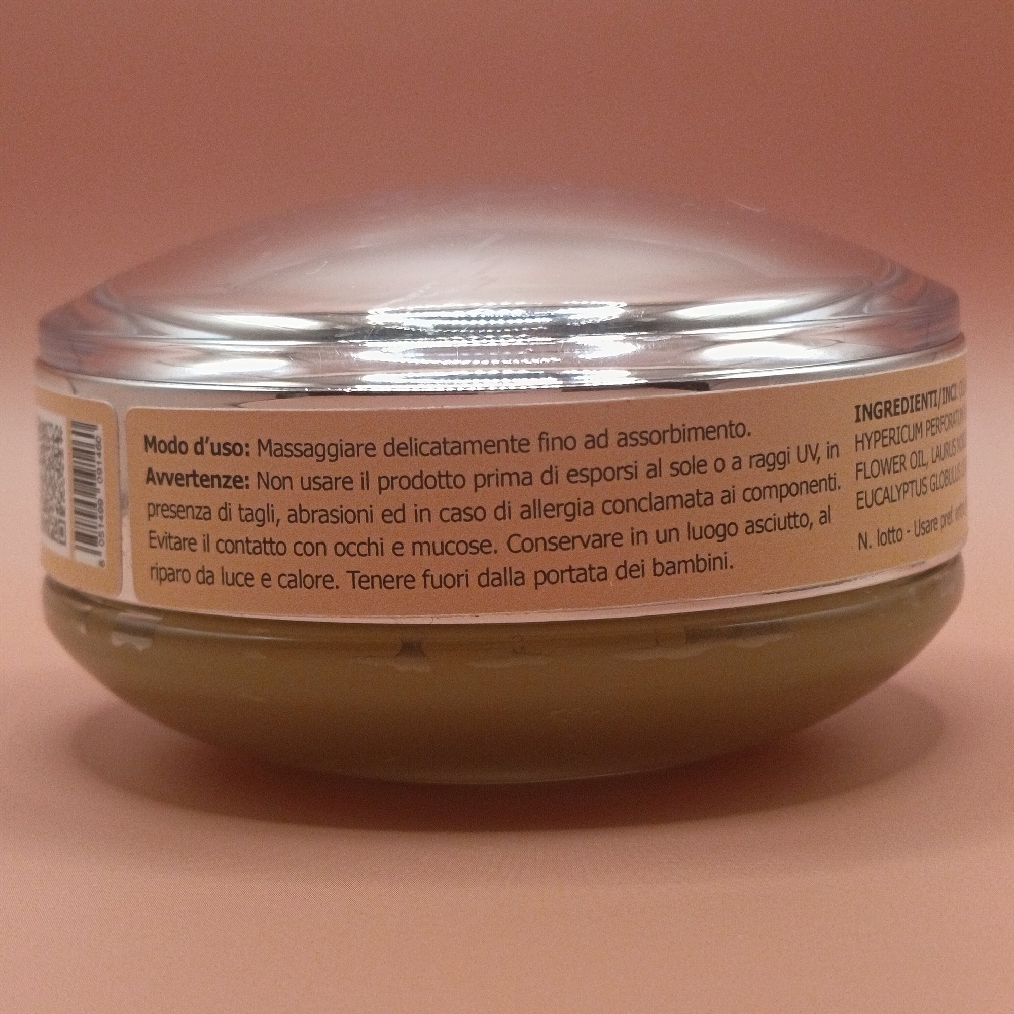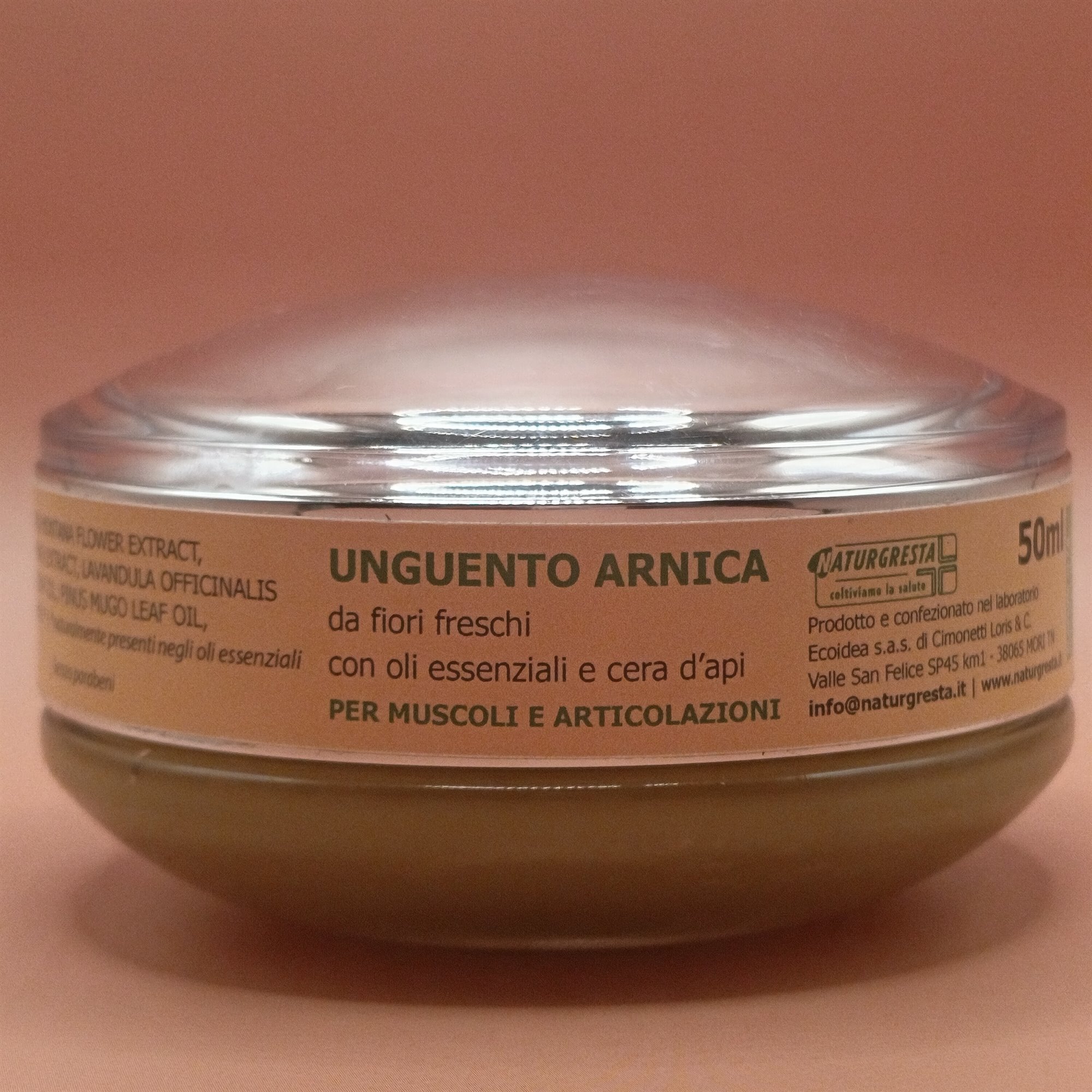 Ingredienti: olio extra-vergine di oliva, cera d'api, estratto di fiori di Arnica, estratto di fiori di Iperico, estratto di fiori di Spirea ulmaria, olio essenziale di Lavanda, olio essenziale di Alloro, olio essenziale di Rosmarino, olio essenziale di Pino mugo, olio essenziale di Eucalipto