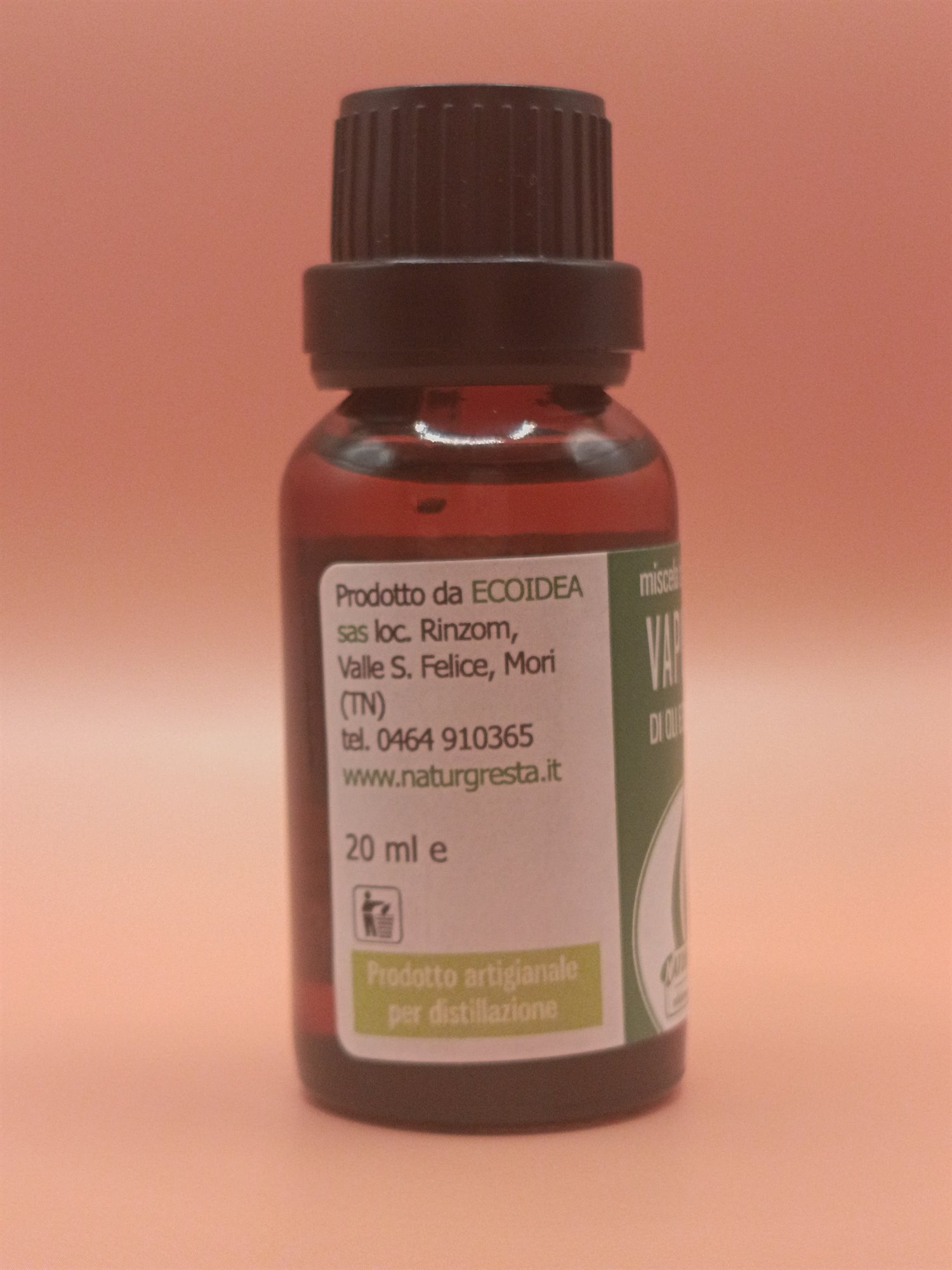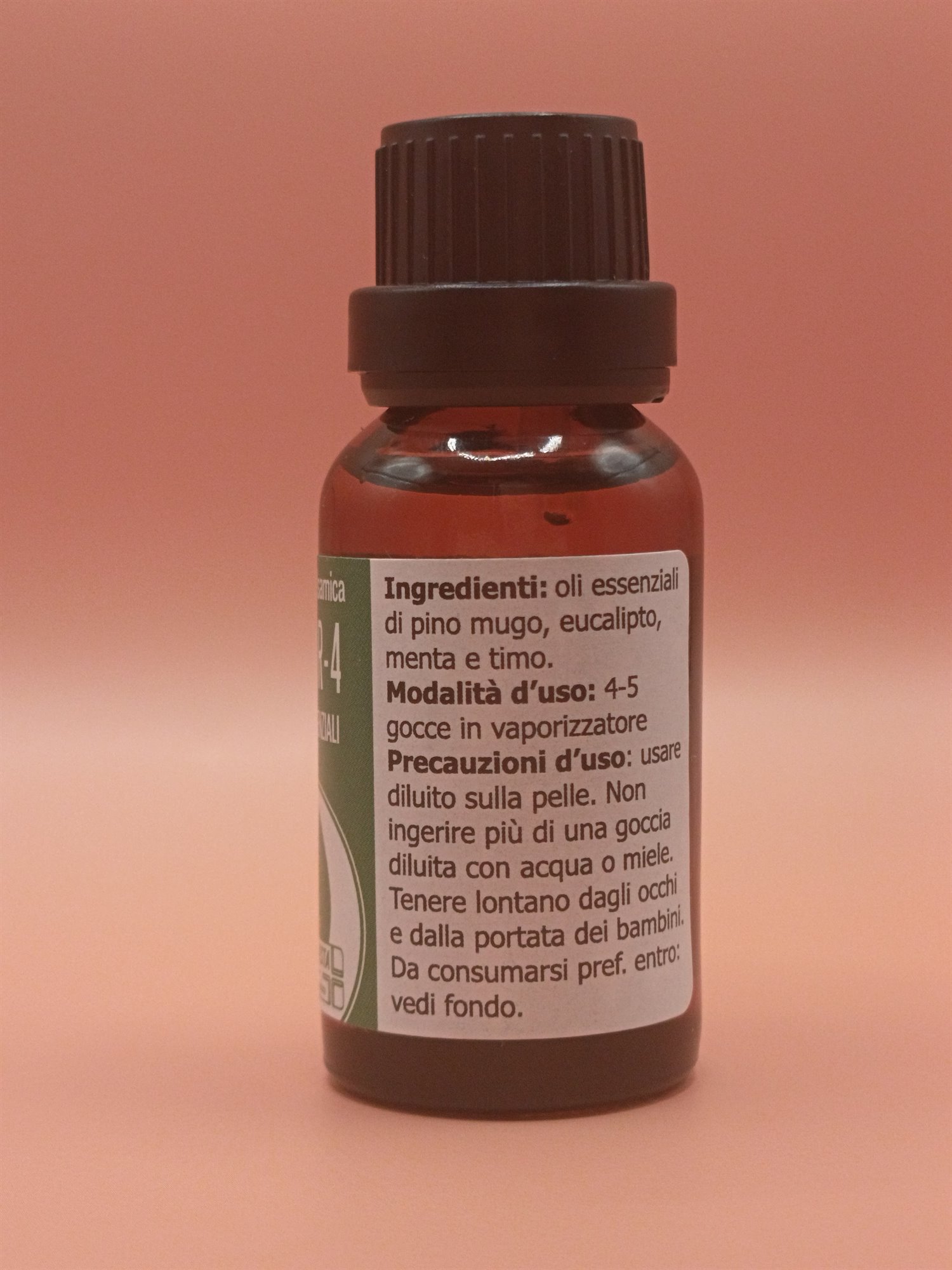 Ingredienti: olio essenziale di Pino mugo* (Pinus mugo Turra), olio essenziale di Eucalipto (Eucalyptus globulus Labill.), olio essenziale di Menta* (Mentha x piperita L.), olio essenziale di Timo* (Thymus vulgaris L.) - 100% puro